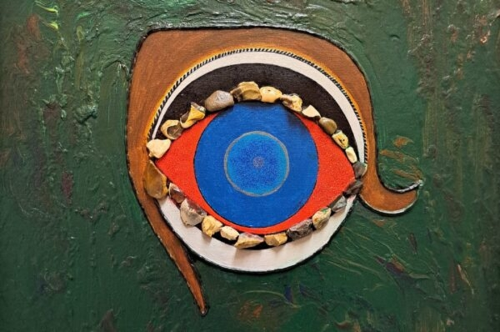 Acrylic painting where dark green colour it is more prodominant, also some collage using little stones around plus some little brillants used on top of the ‘eye’.
