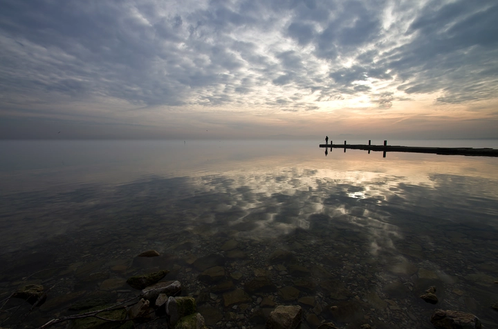 the beginning of a new day, between the sky and the lake, a fisherman waits in the calm of the morning. Hight definition photo 4800x3200 px - 300 dpi