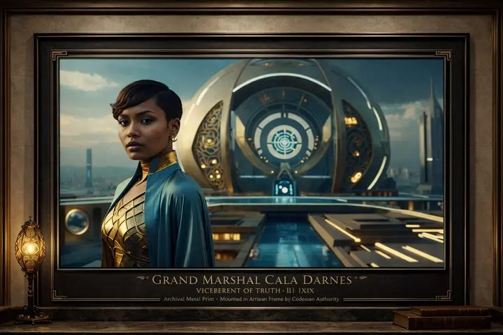Standing before a monumental civic interface and skyborne architecture, Cala Darnes embodies executive authority with calm restraint. The portrait reads like governance at its highest tier—where com