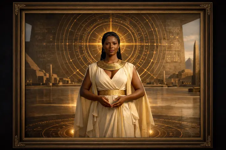 This artwork presents a regal Elysian woman standing in luminous stillness before a vast celestial-temple gateway, crowned by a radiant harmonic sun-disc. Her ceremonial garments and gold adornments