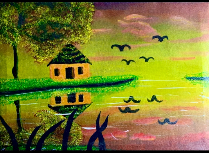 This acrylic painting captures a tranquil sunset scene, showcasing a breathtaking blend of vibrant hues in the sky—orange, pink, and purple. The painting