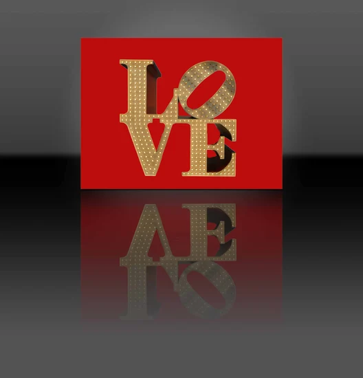 "LOVE IV" - A bold, luminous “LOVE” commands attention in radiant gold, set against a striking red backdrop that evokes passion and intensity. The sculptural lettering, dotted with light, feels both
