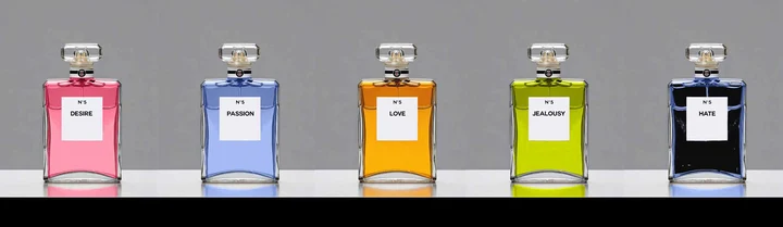 "PARFUMS D'AMOUR" - In my artwork, I depict five perfume bottles that symbolize human emotions: longing, passion, love, jealousy and hate. Each bottle has its own bright color, which emphasizes the