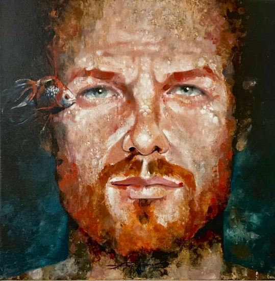 Portrait of Irish man with oriflamme fish flying on his face: human and animal, a silent dialogue real or impossible? Water or air, what is their size?