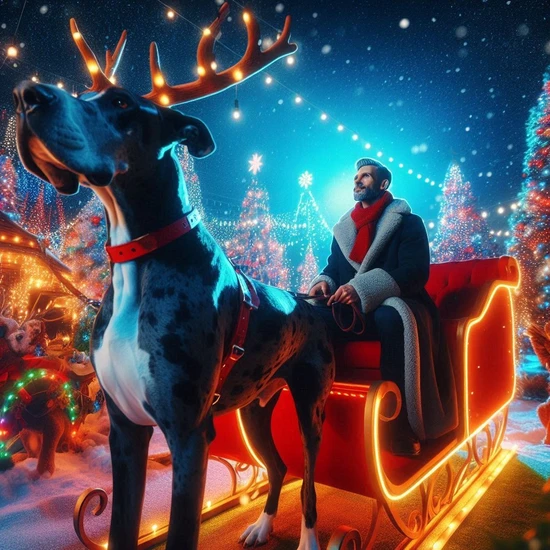 Step into a whimsical and festive world where a large Great Dane, adorned with antlers and a red collar, stands proudly in front of a glowing red sleigh. The sleigh, decorated with twinkling lights,