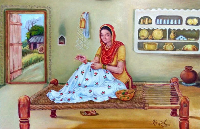 I painted this girl who is doing embroidery on a cotton sheet. I painted a natural girl in bright colors to catch the richness of living in village.