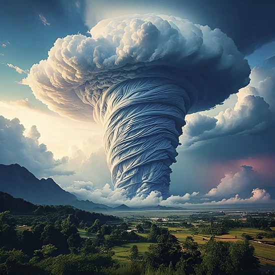 A breath-taking digital AI painting that captures the raw power of nature with a dreamlike softness. This surreal landscape showcases a colossal, spiraling t