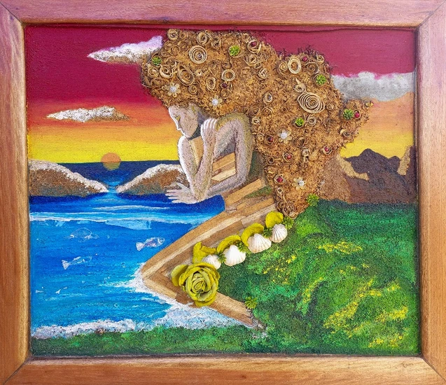 Representa a mãe natureza despertando e tentando se recuperar dos abusos que o homem tem causado ao meio ambiente, nota-se na obra escassez de peixes e aves no céu, inexistência de árvores na terra