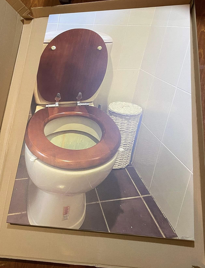 ‘Blue waves -a memory’ , starts with B ends with Y. Spells Battery. The toilet apparatus was designed by the artist and printed on Canvas by a third party (not a painting). Photograph taken by arti