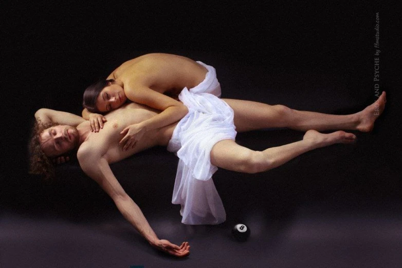 Aliaksandr Zharnasek's painting "Eros and Psyche" offers a captivating modern interpretation of the classic mythological tale. The composition features two figures, a man and a woman, locked in an intimate and serene embrace. The man lies on his back, his body draped in a soft white cloth, while t