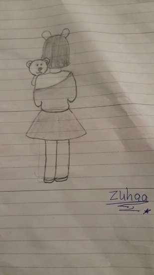 This captivating artwork, titled "Alone Girl", is a simple yet evocative pencil sketch that showcases the remarkable talent of a 13-year-old artist. The piece depicts a young girl standing with her back to the viewer, holding a teddy bear close to her shoulder. The girl's hair is styled with two s