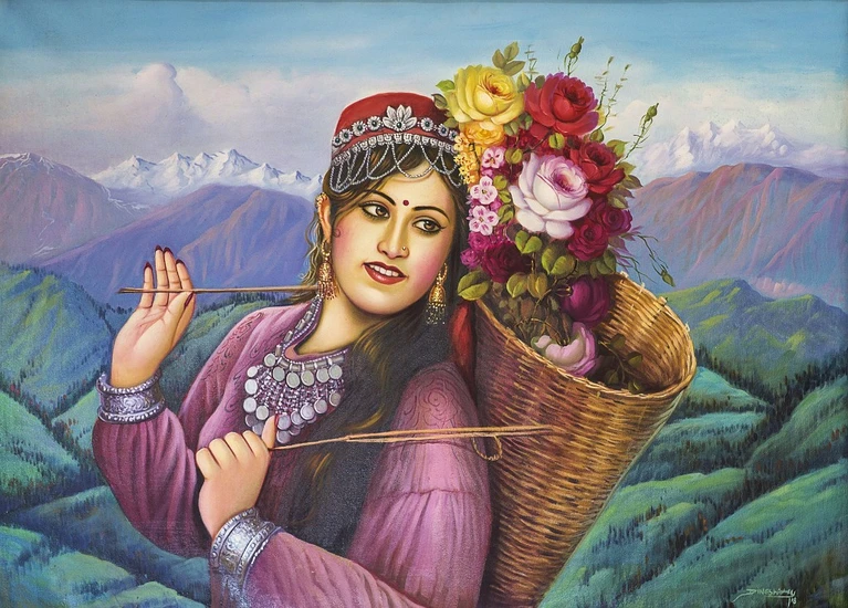 Blossoming Hill Beauty The woman in this painting is representative of the Himalayan beauty and more specifically Himachal Pradesh, a province in the North of India. The dress and the ornaments she