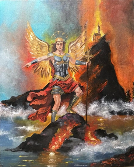 In the midst of chaos, St. Michael stands firm. His armor glints with a light, reflecting the flames of destruction that rage around him. This painting captures the essence of divine courage and str