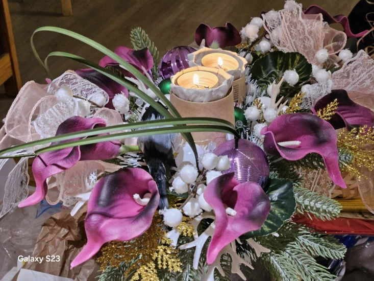 The Kalla Candle Arrangement you may burn real candles, it has 2 double bows, a nordic bird, little snowballs, 10 Fabric Kalla flowers, Fake spruce needles and horn branches, lasts year after year,