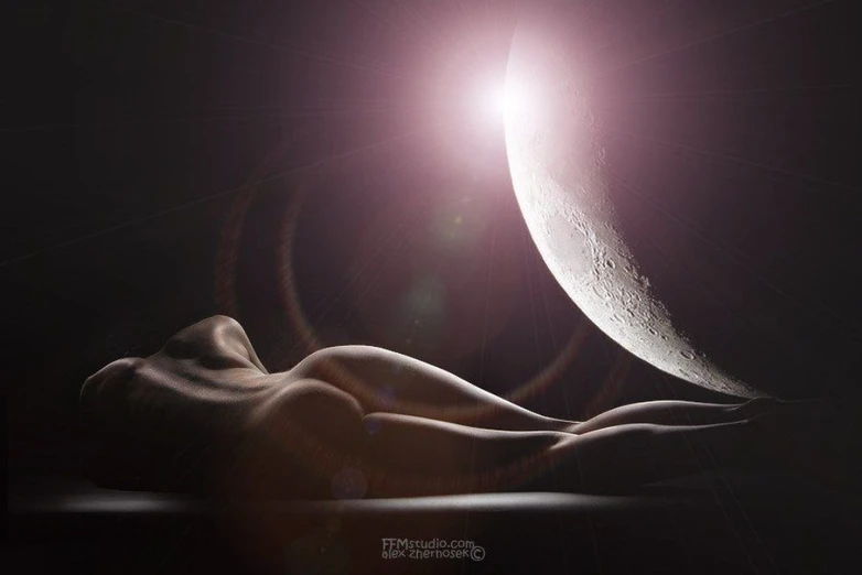 Aliaksandr Zharnasek's painting "inbound4653144962612584458" is a striking and surreal composition that captivates the viewer with its dreamlike atmosphere and cosmic allure. At the center of the scene is a nude human figure, lying on their side with a sculpted, smooth form that blends seamlessly