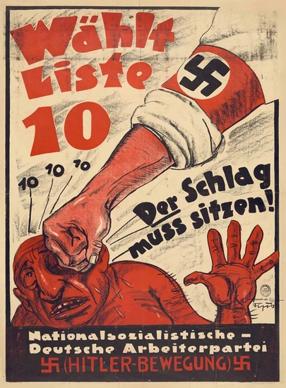 Political campaign poster for Adolf Hitler for the Reichstagswahl election showing the fist of an arm with a Nazi armband punching a stereotypical Jewish man.