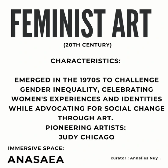 Feminist Art is an art movement that emerged in the 1970s, focused on challenging gender inequalities in art and society. It seeks to highlight women’s experiences, history, and contributions, using