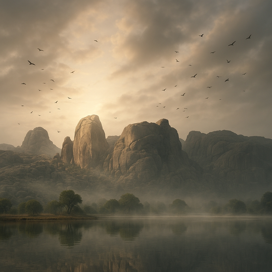 This piece beautifully captures a tranquil and awe-inspiring landscape, likely inspired by the rocky hills of Bauchi, Nigeria. The composition is rich with atmosphere and emotion