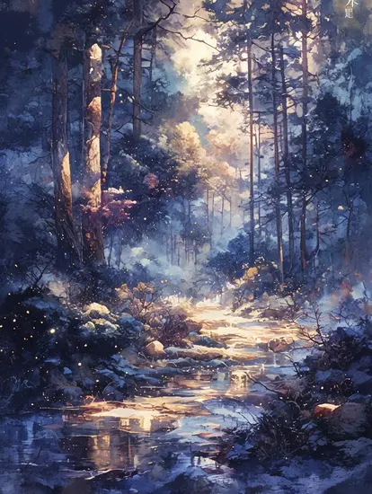 這幅畫作展現了一片夢幻般的森林景色,仿佛從童話世界中浮現。畫面的色調以深藍和金黃色為主,營造出靜謐而神秘的氛圍。光線透過高聳的松樹縫隙灑落在蜿蜒的溪流上,形成斑斕的倒影,使整體畫面充滿層次感與動態美。森林間點綴著細小的金色光點,宛如飛舞的精靈,增添了奇幻色彩。筆觸柔和且細膩,水彩的暈染效果強化了光影的變化,使畫面充滿詩意與靈動感。這幅畫不僅捕捉了自然的寧靜之美,更傳遞了一種超脫現實的神秘感,令