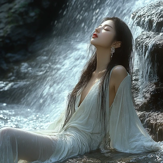 A serene yet potent image unfolds, a juxtaposition of nature's raw power and human fragility. A colossal waterfall, a cascade of liquid diamonds, dominates the scene. Bathed in the ethereal glow of
