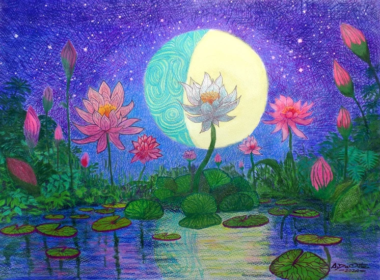 A lily flowers stands in front a full Moon